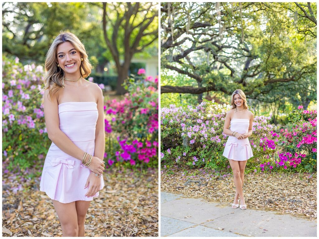 We wandered through the park, stopping anywhere the light hit just right (which, honestly, was everywhere). Between the blooming flowers, iconic Savannah charm, and her stunning style, this session was the perfect mix of soft, romantic spring vibes and bold senior energy.