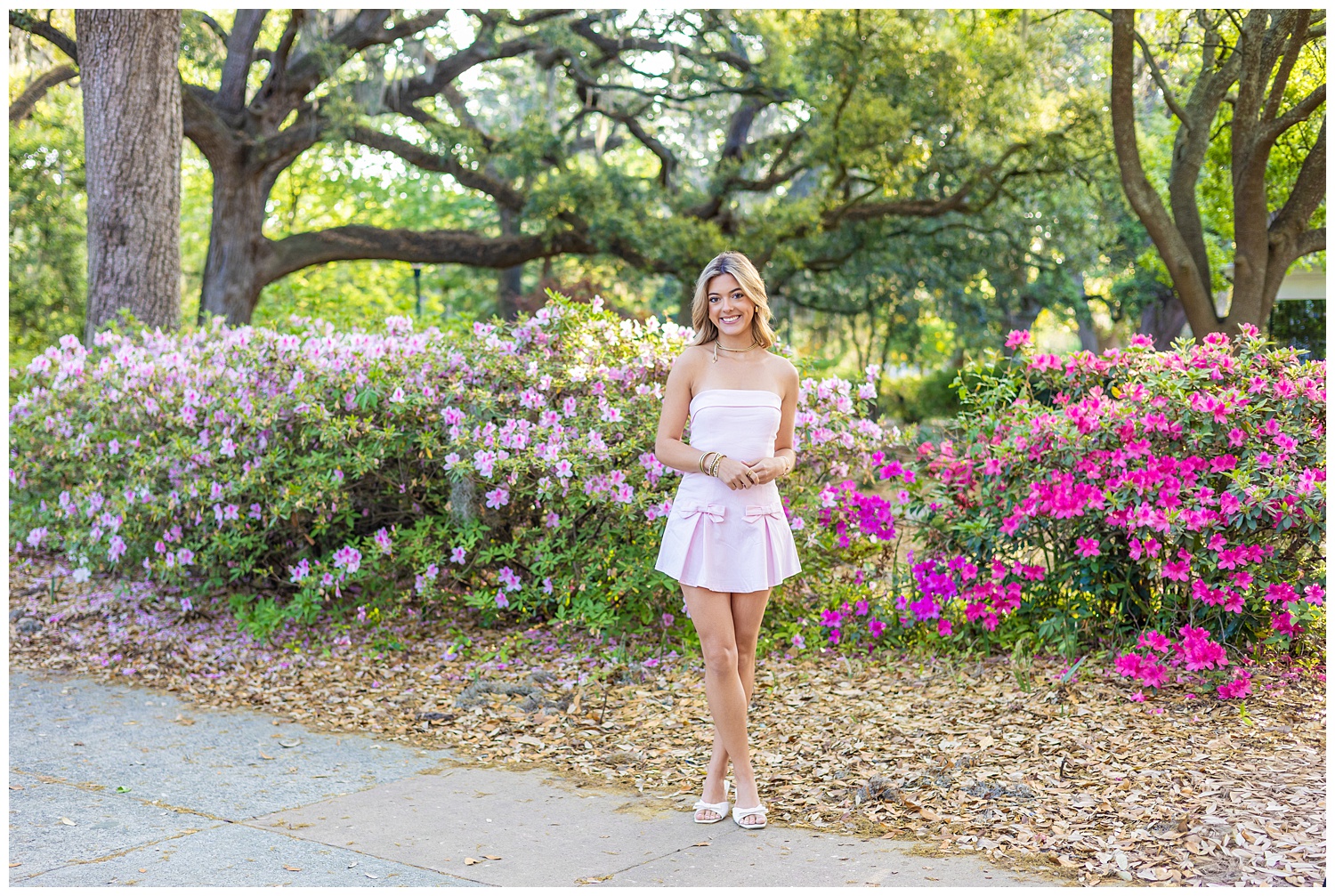From the moment we started, the light was soft and dreamy, filtering through the trees and giving us that gorgeous glow in every single shot. The azaleas were popping with color, the greenery was lush, and every little corner of the park felt like a perfect backdrop just waiting for Mary to step into it.